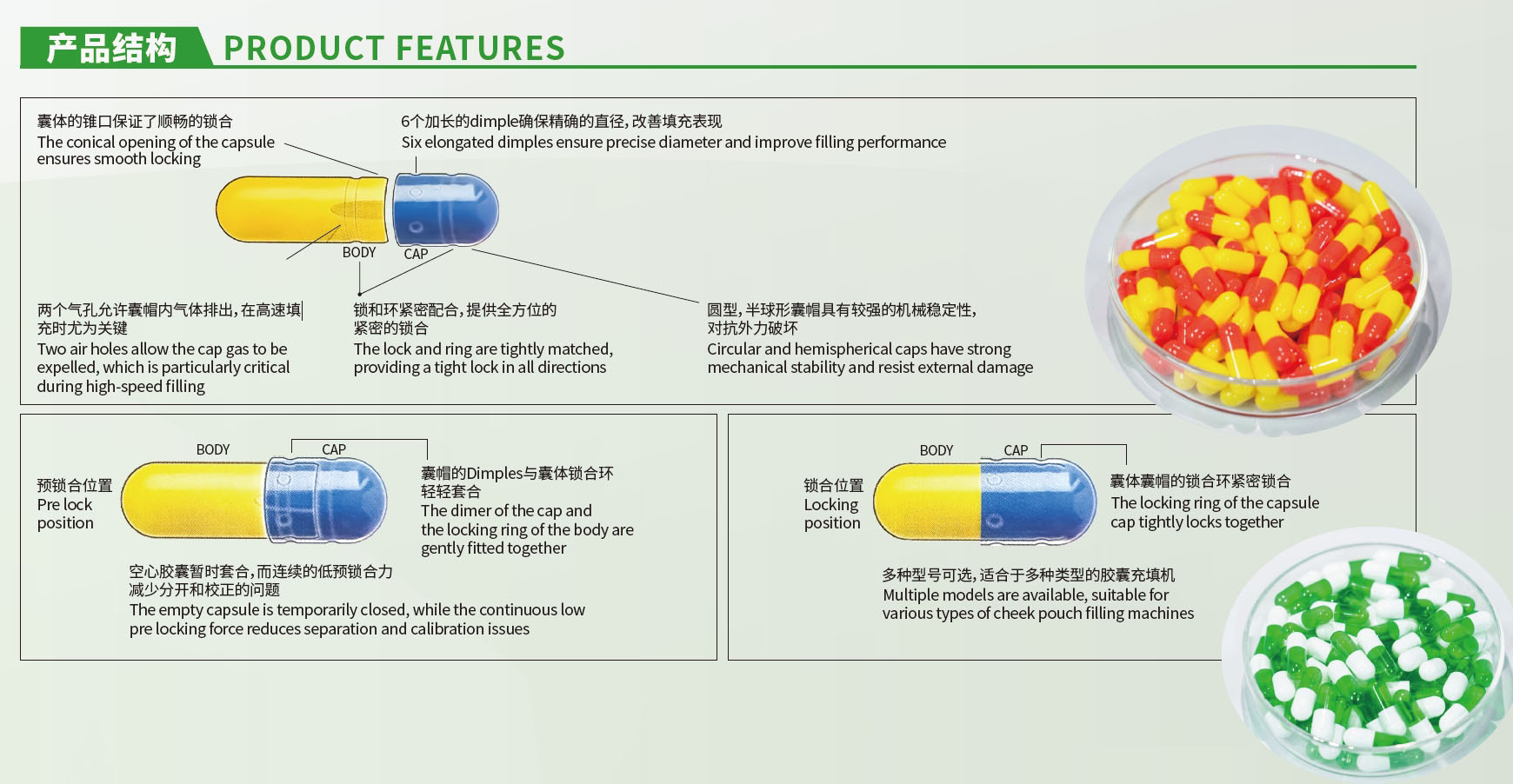 空心膠囊由藥用明膠加輔料精制而成的帽、體兩節膠囊殼組成。主要用于盛裝固體藥物。如自制散劑、保健品、藥劑等,為服用者解決了難入口、口感差的問題,實現了良藥不再苦口。空心膠囊越來越受歡迎,首先膠囊的形狀細長,易于吞服,是最受消費者歡迎的劑型;此外,膠囊能夠很有效地掩蓋內容物的令人不舒服的味道和氣味。膠囊的尺寸有多種多樣,包括00號加長和5號膠囊。膠囊上還可印上文字、商標和圖案,呈現出獨特的定制外觀。